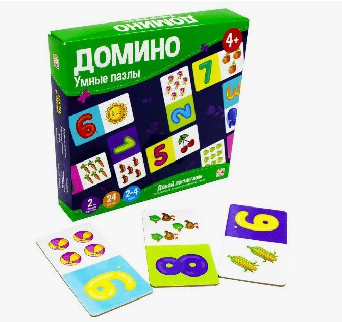 Умные пазлы. Давай посчитаем«Умные пазлы. Давай посчитаем» — это развивающее домино для детей, которое в игровой форме поможет освоить счёт в пределах 10 и закрепить полученные навыки. Игра способствует развитию логического мышления, внимания и памяти, обучает командной игре. Карточки-домино выполнены из плотного картона, крупные детали удобны для детских ручек. Порадуйте своего ребенка развивающим домино «Умные пазлы. Давай посчитаем»!